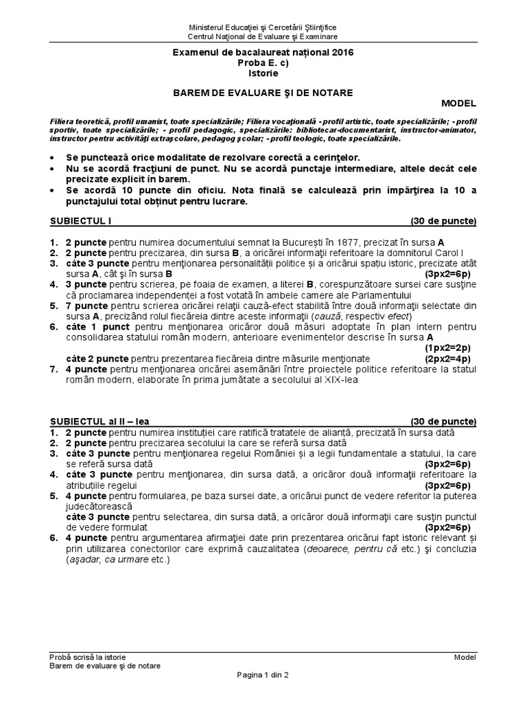 Barem model subiecte istorie bacalaureat 2019. Modelele orientative de subiecte/biletele de examen/pachetele de fișiere pentru examenul național de bacalaureat au fost concepute în acord cu. Găsiţi şi testele de antrenament bac 2021 (toate seturile). Absolvenţii ciclului liceal care au studiat profilul umanist vor susţine, miercuri, examenul de bacalaureat la istorie. Edu.ro publică aici modele de subiecte la istorie.